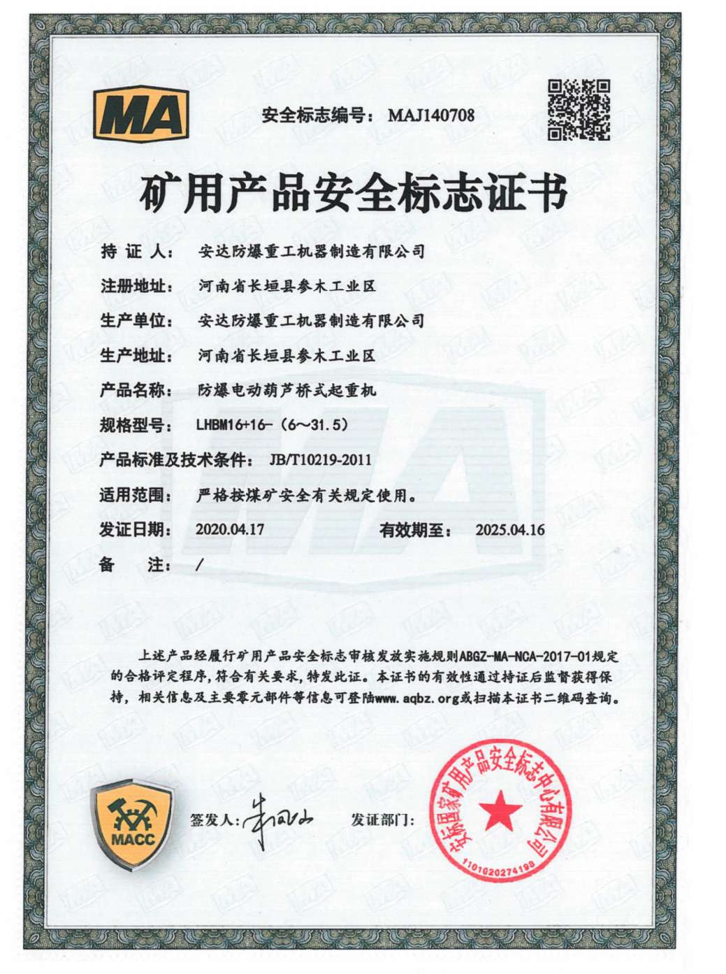 防爆鋼絲繩葫蘆橋式起重機 礦用產品安全標志證書