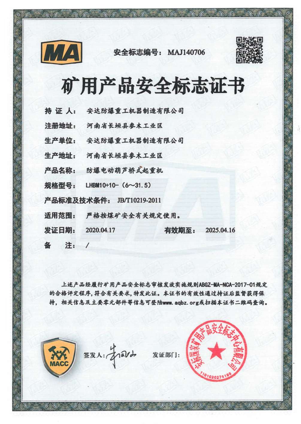 防爆鋼絲繩葫蘆橋式起重機 礦用產品安全標志證書