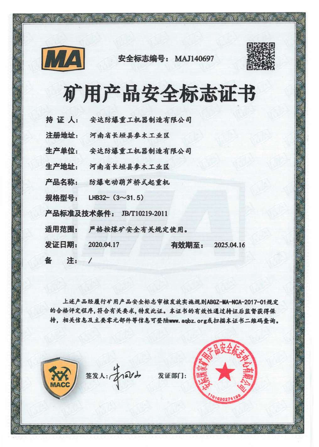 » 防爆鋼絲繩葫蘆橋式起重機 礦用產品安全標志證書
