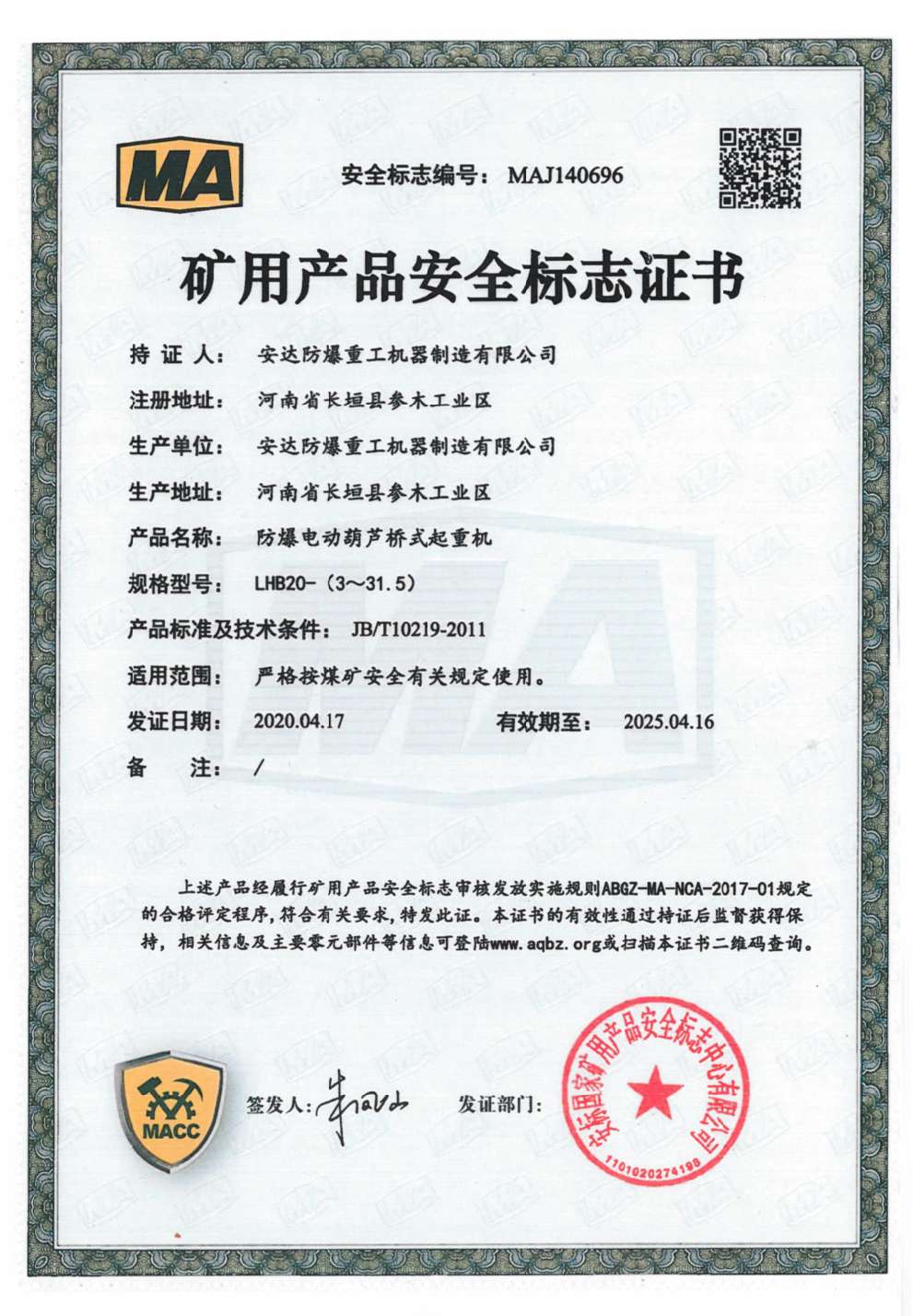 防爆鋼絲繩葫蘆橋式起重機 礦用產品安全標志證書