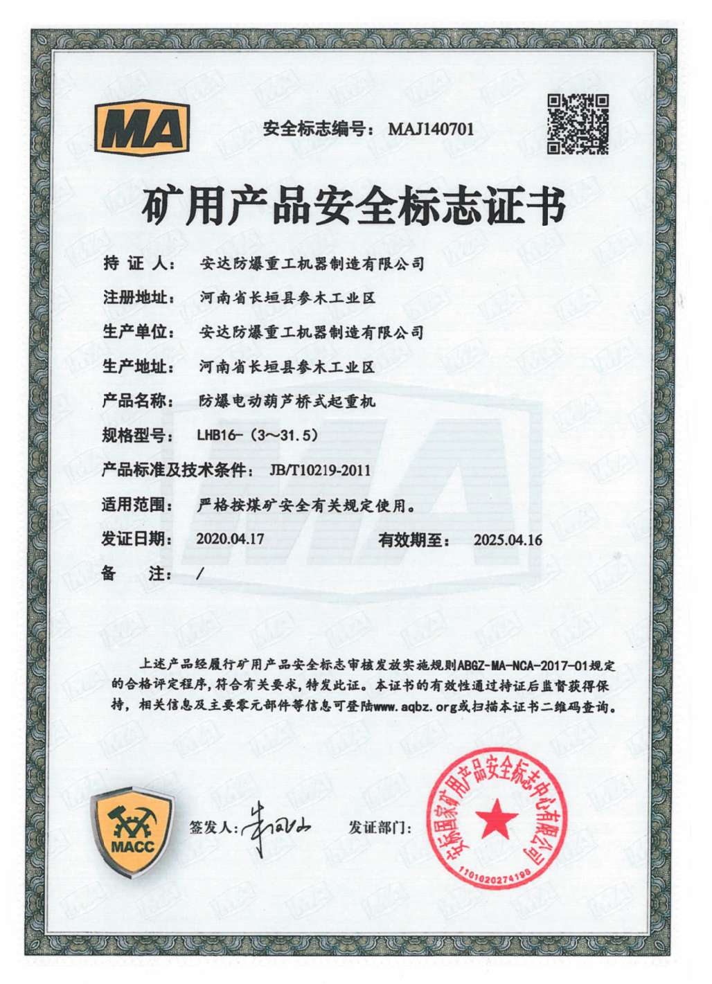 » 防爆鋼絲繩葫蘆橋式起重機 礦用產品安全標志證書