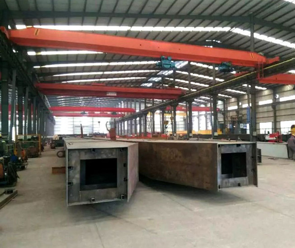 - 橋架:橋式起重機的橋架是一個兩端支撐在平行的兩條架空軌道上平移運行的單跨平板橋。它由主梁、端梁等部分組成,主梁跨過廠房,兩端用端梁連接,主梁外側設有行走平臺和安全欄桿。橋架上裝有大車驅動機構、電箱、升降機構、小車運行軌道和輔助線架。