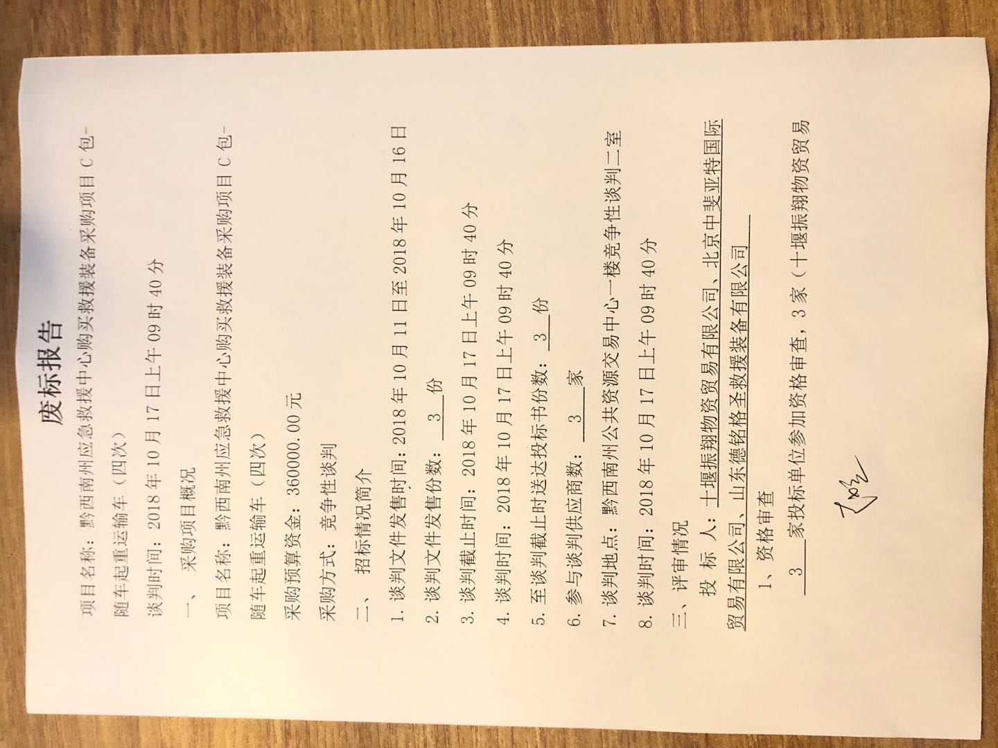 黔西南州應急救援中心購買救援裝備采購項目C包-隨車起重運輸車(四次)廢標公告