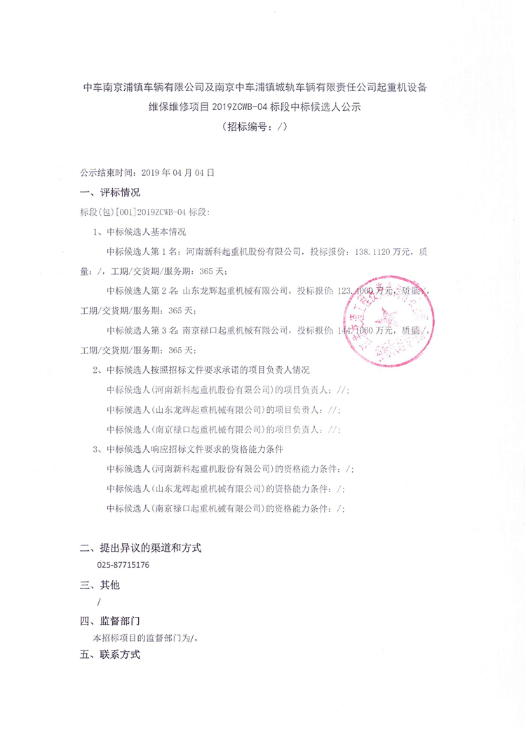 中車南京浦鎮車輛有限公司及南京中車浦鎮城軌車輛有限責任公司起重機設備維保維修項目2019ZCWB-04標段中標候選人公示