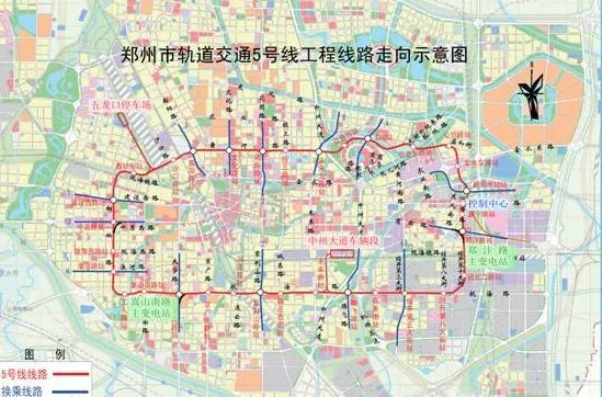 ②規劃 :鄭州地鐵5號線沿黃河路、商務外環路、龍湖外環路、盛和街、心怡路、經開第十大街、航海路、桐柏路、西站路等布置,覆蓋鄭州中心城區,屬于城市核心區外圍邊緣的環形線路。線路全長40.7公里,均為地下線,全線共設車站32座,其中換乘站15座,站間距為1.4公里,功能定位為鄭州中心城骨干線。