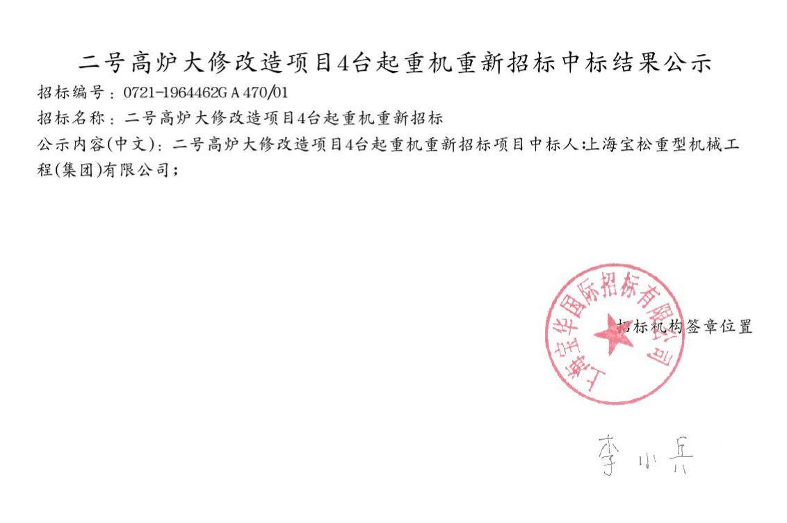 二號高爐大修改造項目4臺起重機重新招標中標結果公示