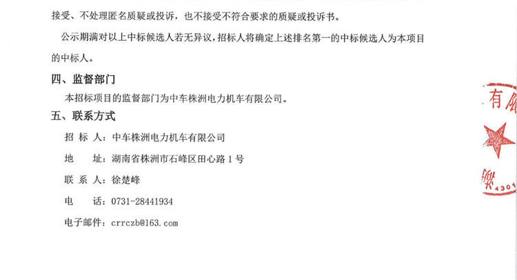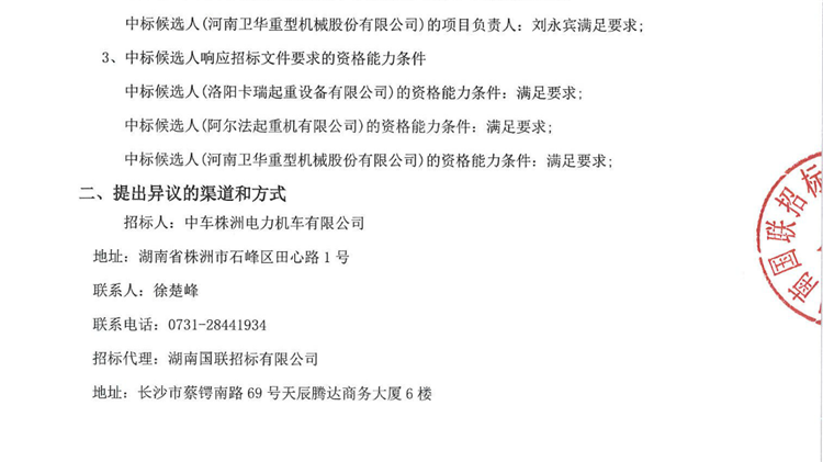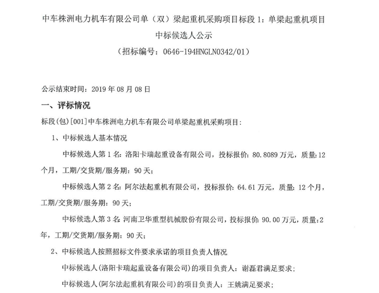中車株洲電力機車有限公司單(雙)梁起重機采購項目標段1:單梁起重機項目中標候選人公示