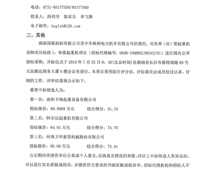 移動版:中車株洲電力機車有限公司單(雙)梁起重機采購項目標段1:單梁起重機項目中標候選人公示