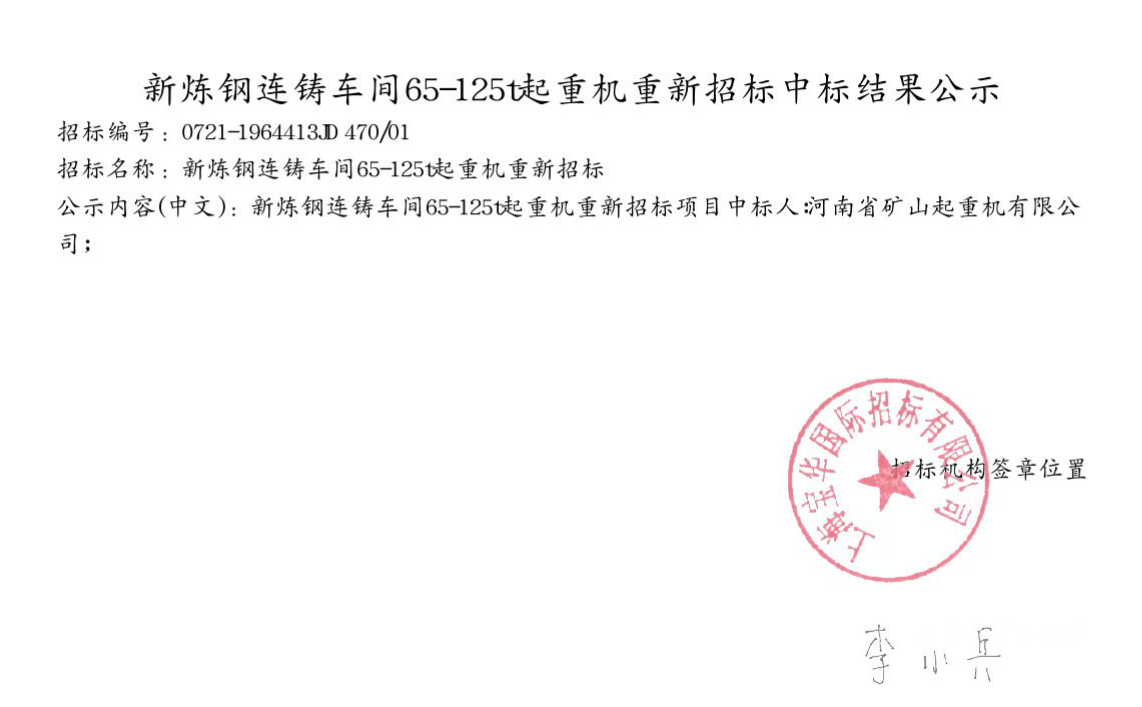 移動版:新煉鋼連鑄車間65-125t起重機重新招標中標結果公示