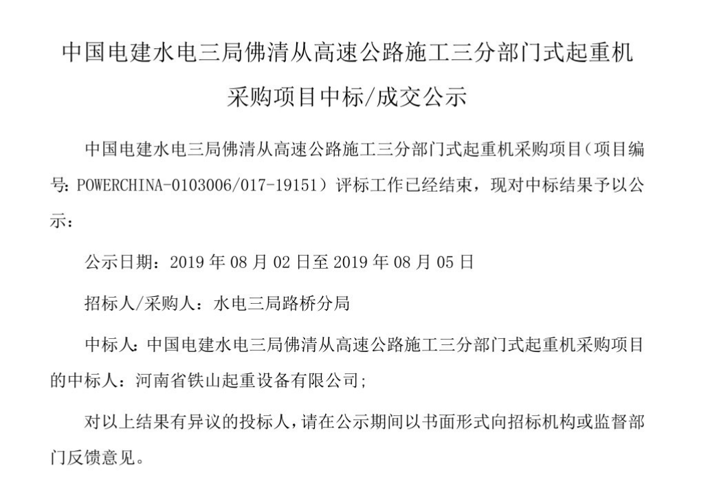 移動版:中國電建水電三局佛清從高速公路施工三分部門式起重機采購項目中標公示