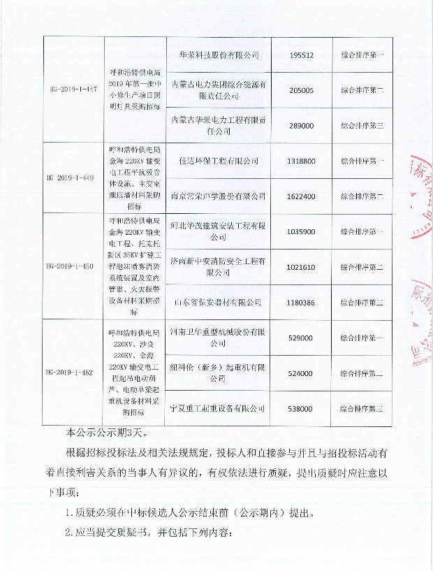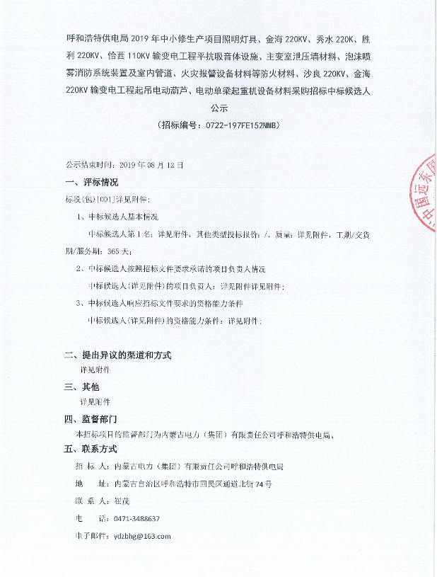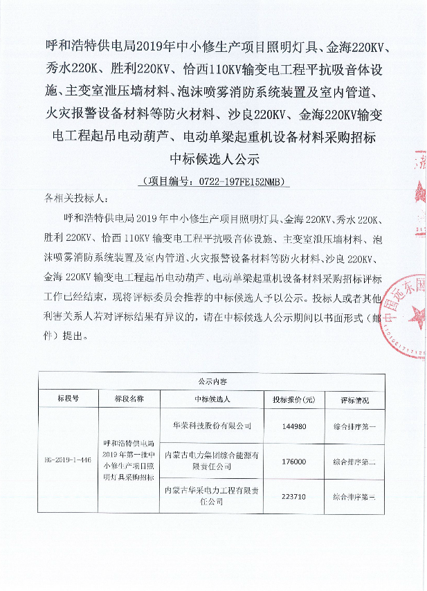 呼和浩特供電局2019年中小修生產項目照明燈具、金海220KV、秀水220K、勝利220KV、恰西110KV輸變電工程平抗吸音體設施、主變室泄壓墻材料、泡沫噴霧消防系統裝置及室內管道、火災報警設備材料等防火材料、沙良220KV、金海220KV輸變電工程起吊電動葫蘆、電動單梁起重機設備材料采購招標中標候選人公示