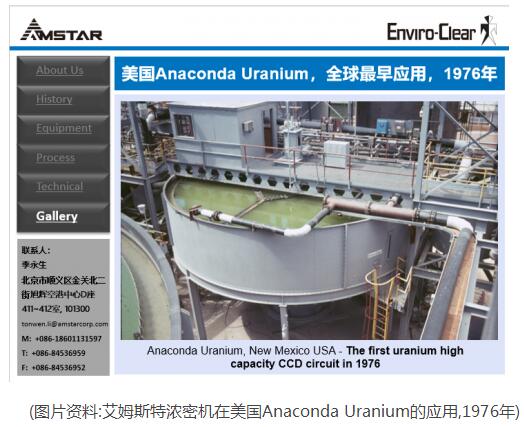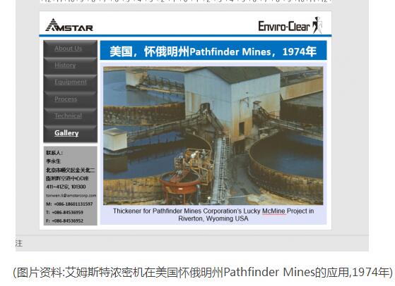 艾姆斯特(AMSTAR ENVIRO-CLEAR)的濃密機產品在全球范圍內得到應用,其中,在中國地區,艾姆斯特(AMSTAR ENVIRO-CLEAR)自1984年向張家口金礦提供了第一臺直徑17英尺的高效濃密機(可能是中國的第一臺高效濃密機)起,1992年向貴州翁福新龍壩選廠提供直徑50英尺的高效濃密機;1992年向黃麥嶺磷礦提供了直徑23英尺的高效濃密機;1995年向神華大柳塔煤礦提供了兩臺直徑30米的高效濃密機;1995年向張家口金礦提供了第二臺直徑17英尺的高效濃密機;2002年向貴州翁福馬場坪磷礦提供了直徑50英尺的高效濃密機……,如今已在中國地區提供的濃密機等設備近40臺,詳見后附的業績表,國內客戶包括:馬坑礦業,江銅集團,中冶集團、山東黃金、云錫集團、河北鋼鐵、北方工業、南京鋼鐵、昆鋼集團、內蒙地礦、金川集團、神華集團,甕福集團等。